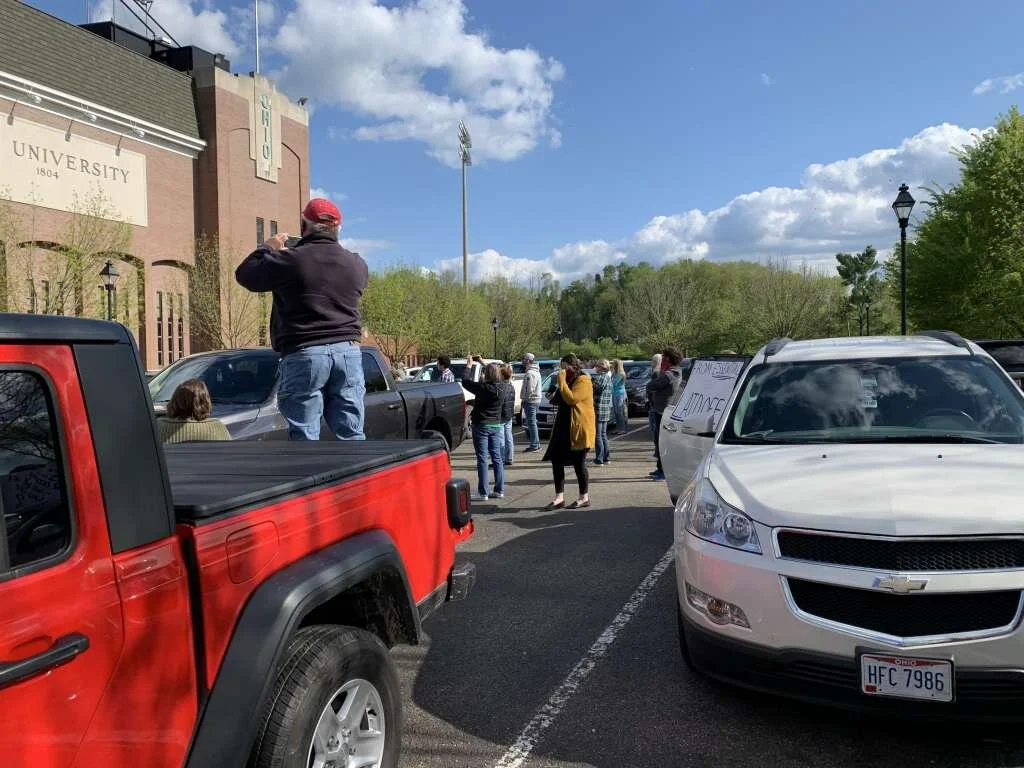 Members of the American Federation of State, County and Municipal Employees (AFSCME) and the American Association of University Professors (AAUP) unions gathered in their cars at the Peden Stadium parking lot. Organizers gave a speech to the crowd before forming a caravan and driving around Athens with their protest signs displayed.