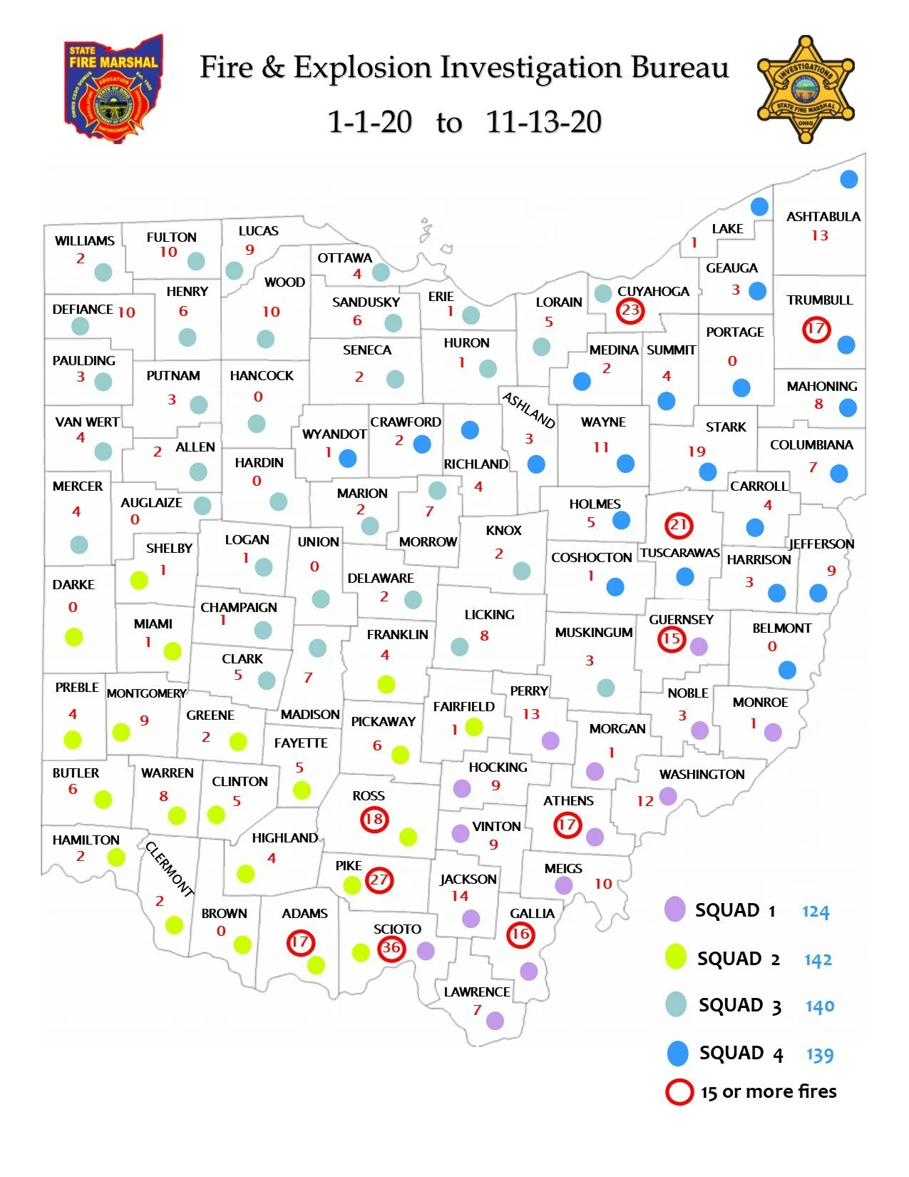 Southern Ohio is also the busiest region in the state for the fire marshal’s office. Six Southern Ohio counties — Athens, Pike, Ross, Adams, Scioto and Gallia — make up roughly 25% of the total fires investigated in 2020.