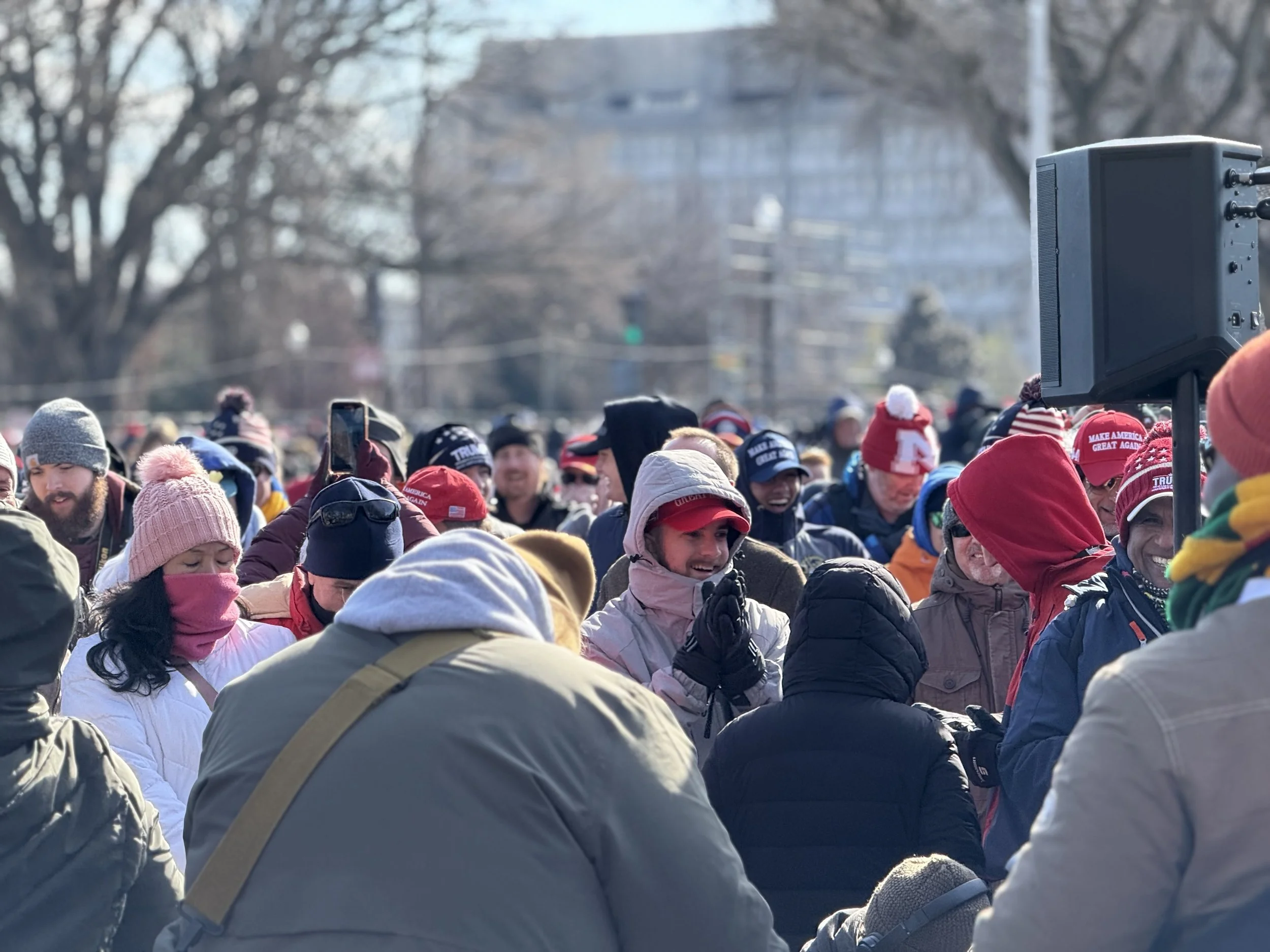 When it’s time for Trump’s inaugural address, a proselytizing Christian steps down from his pedestal and starts playing the speech through his speaker. The crowd lowers its volume and moves to surround the speaker, breaking out in applause each time the President describes another executive order he plans to sign.