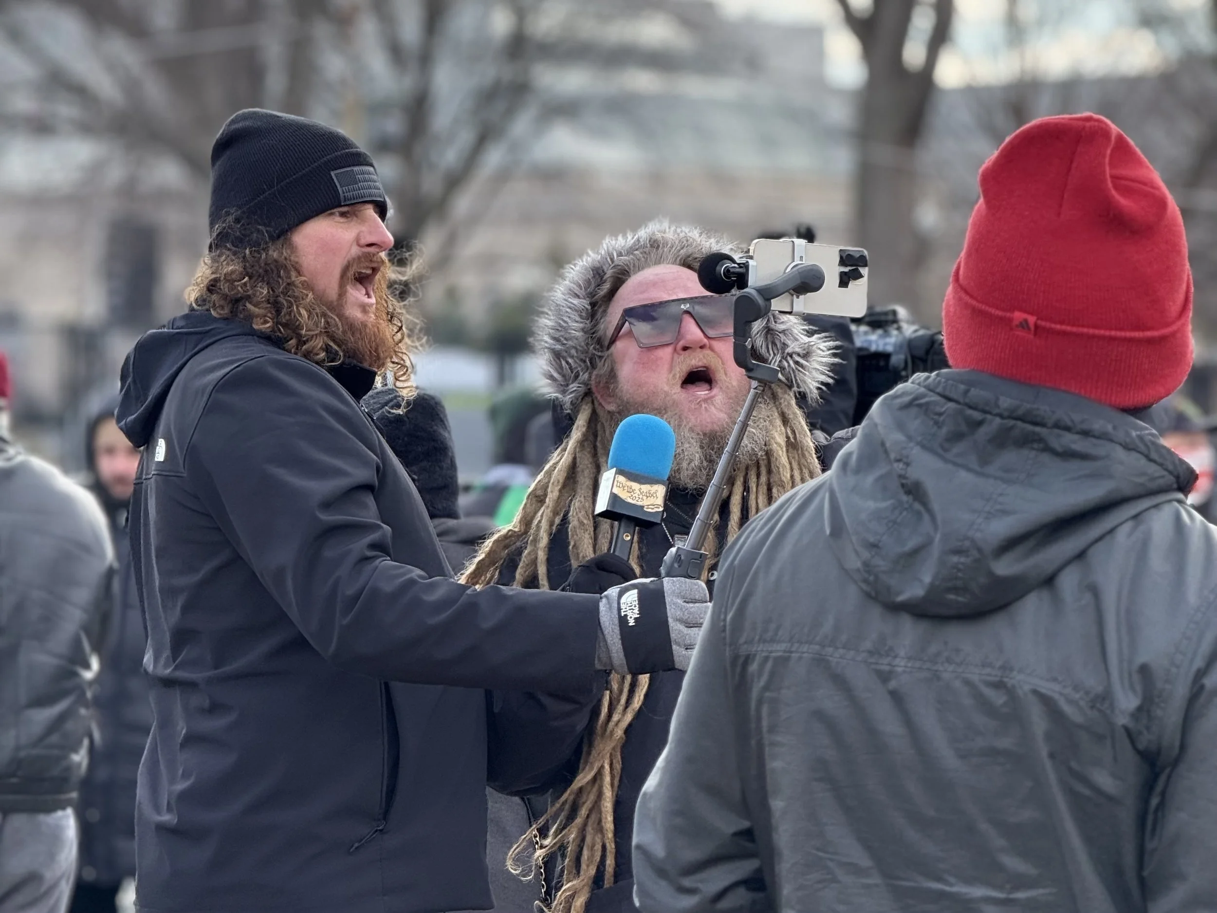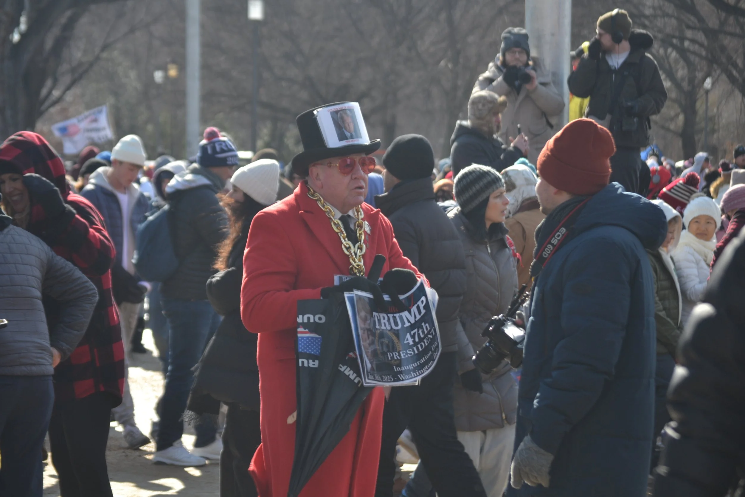 As things wrap up and the crowd disperses, I take the chance to talk to some supporters. I catch Gregg Donovan, whose long red overcoat, top hat and giant gold chain has been catching eyes all morning, as he’s striding down the National Mall away from the Capitol. I’ve noticed him talking to camera after camera, repeating the same phrase. “The golden age of America is coming.” I ask him what this means to him.
