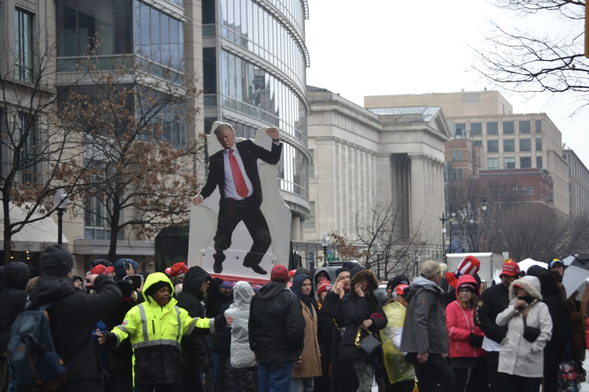 It’s just before noon on the Sunday before Inauguration Day. Tourists sporting red Make America Great Again hats and American flags are waiting in a seemingly endless line that leads to Capital One Arena, where soon-to-be President Donald Trump is expected to appear at a “Make America Great Again Victory Rally” the night before his swearing-in ceremony. A life-sized cutout of Trump bobs above the crowd; looking closer, I notice that they’re passing it up the line, attached to a surfboard.