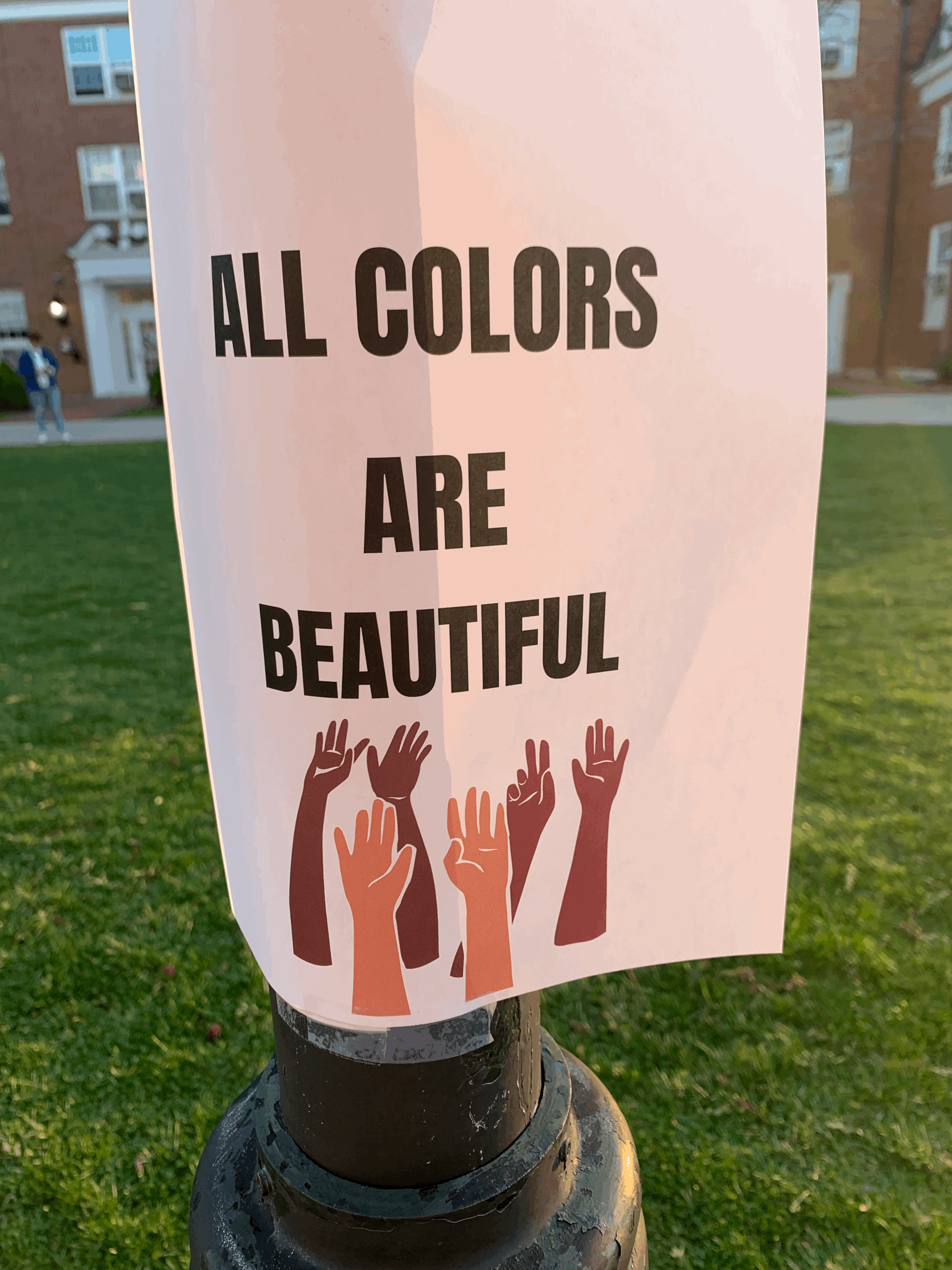 Students gathered outside of Sargent and James Halls Monday evening to protest racist incidents that had occured on campus housing. The New Political reported Monday that racially motivated incidents have occured in Sargent Hall throughout this academic school year. Students spread out around the area and taped pieces of paper that read “Black Lives Matter” and “All colors are beautiful” to the dorm buildings’ walls and light poles. Signs with messages about combating racism were taped with flowers to nearby benches, while students drew messages in chalk on the sidewalks.