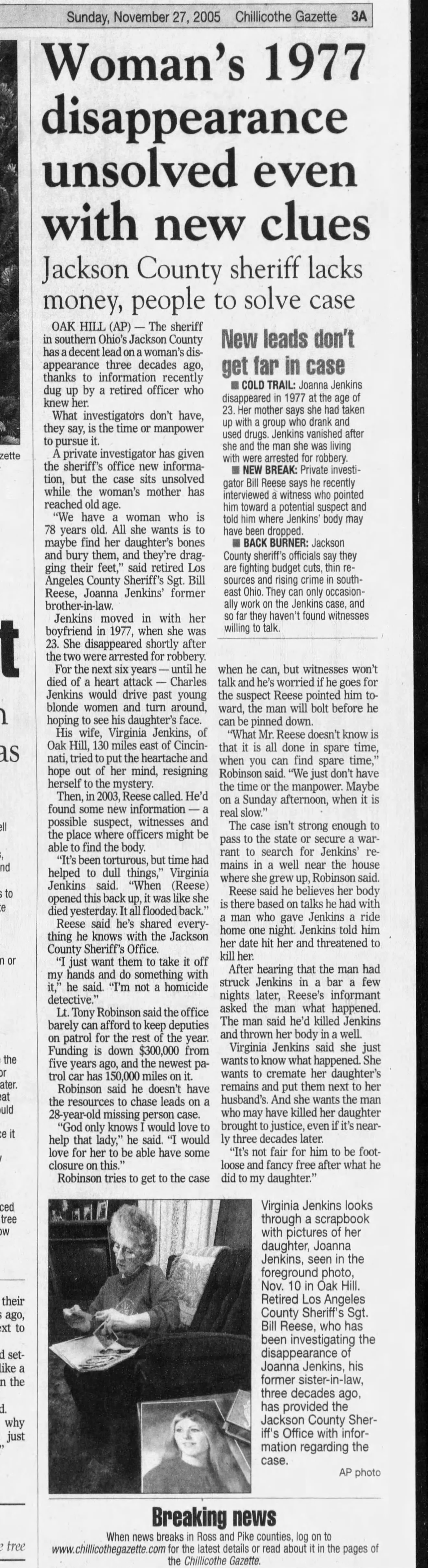 The 2005 Chillicothe-Gazette article also noted a quote from Virginia Jenkins, Joanna Jenkins’ mother, that she wants justice, even if it was 30 years later.