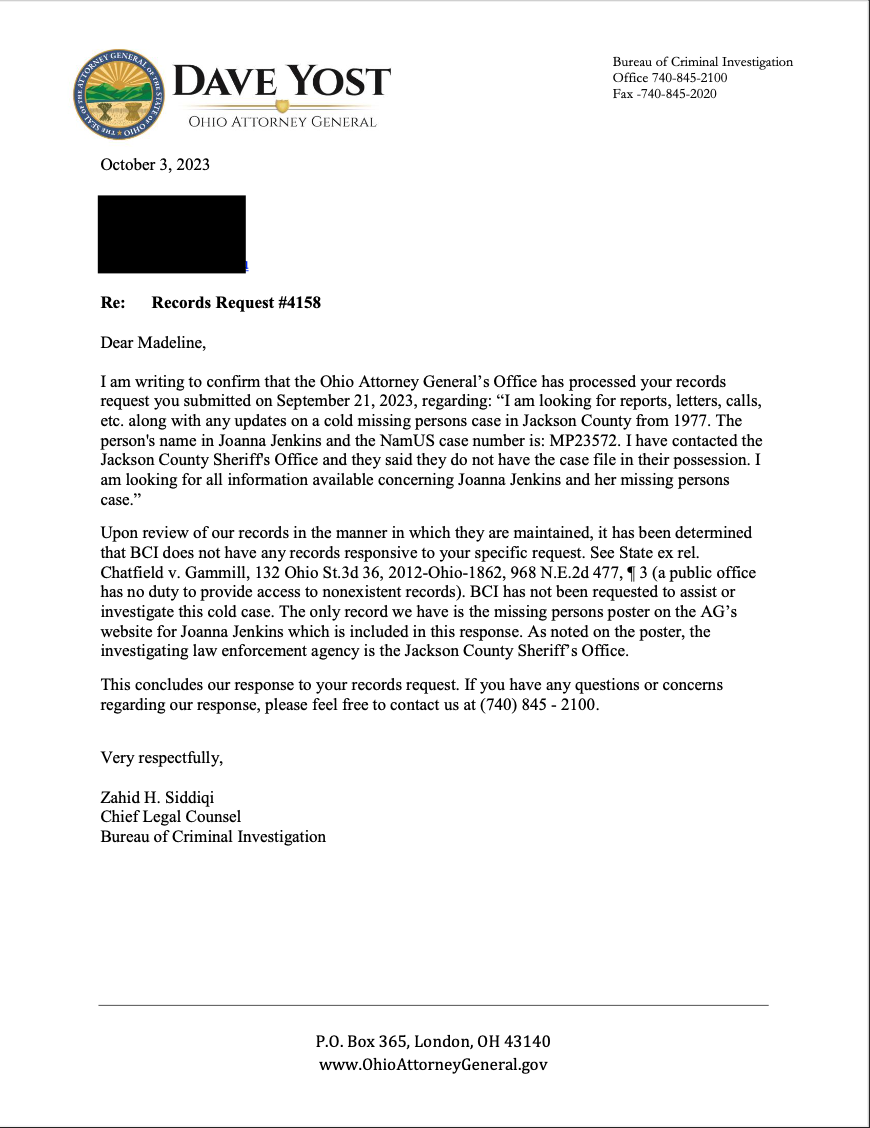 I sent a request for the case file of Joanna Jenkins to the Ohio attorney general’s office on Sept. 21.