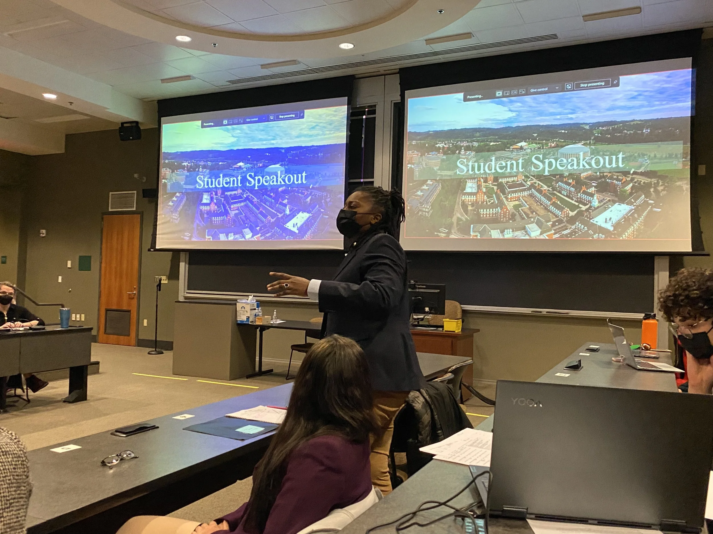 Black Affairs Commissioner Trinity Robinson speaks to the character of Kalkat. Photo by Audrianna Wilde.