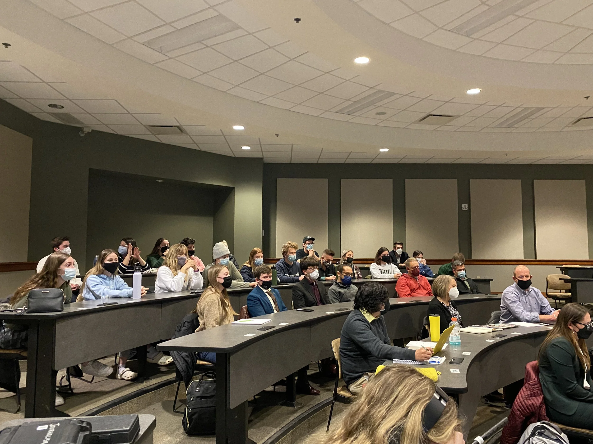Several members of Kalkat’s business fraternity, Alpha Kappa Psi, showed up to Wednesday’s meeting in support of Kalkat. Photo by Audrianna Wilde.