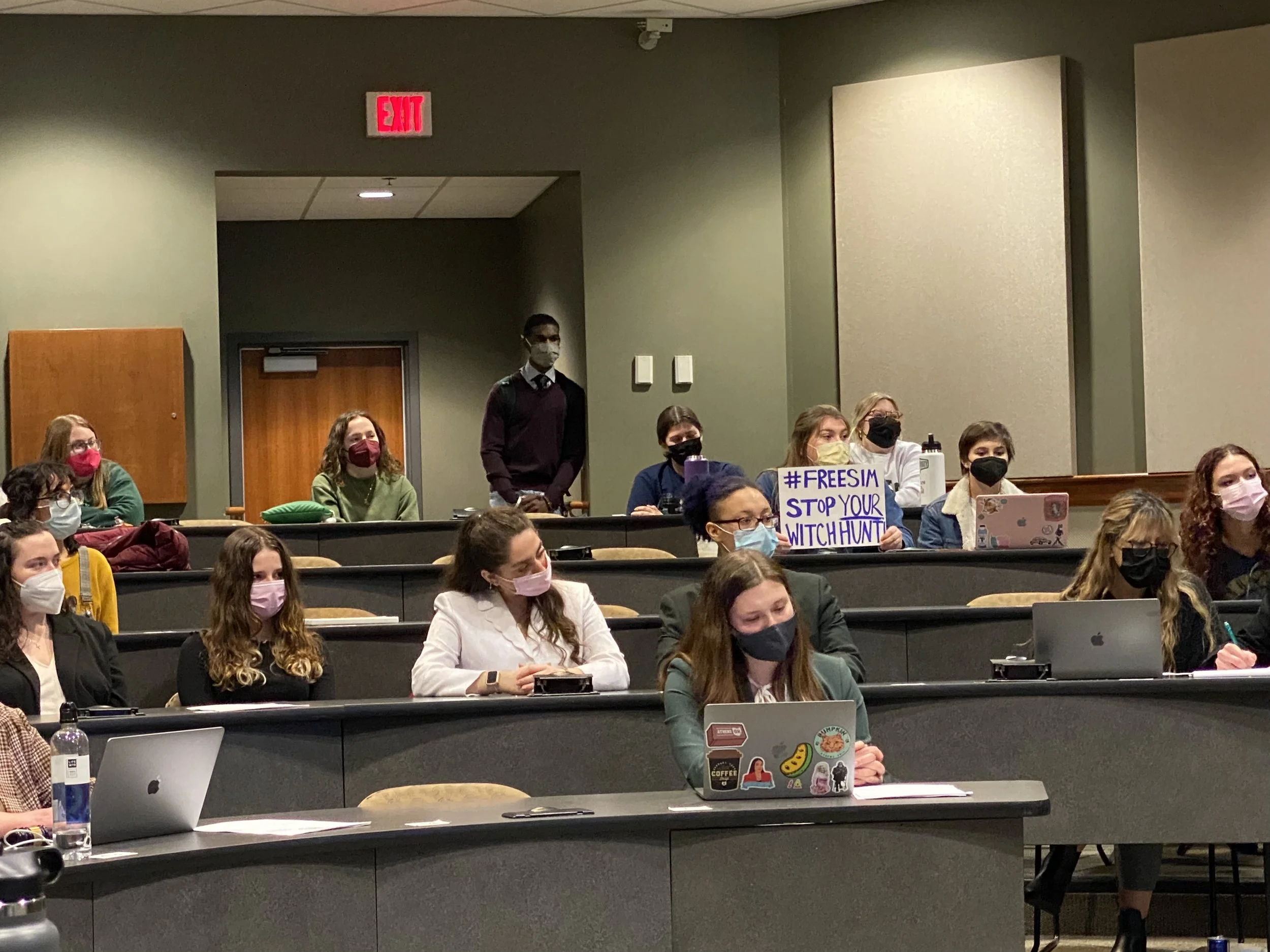 Courtney Archibald, former student senator for the College of Fine Arts, sits among the audience with a sign reading “#FREESIM STOP YOUR WITCH HUNT.” Photo by Audrianna Wilde.