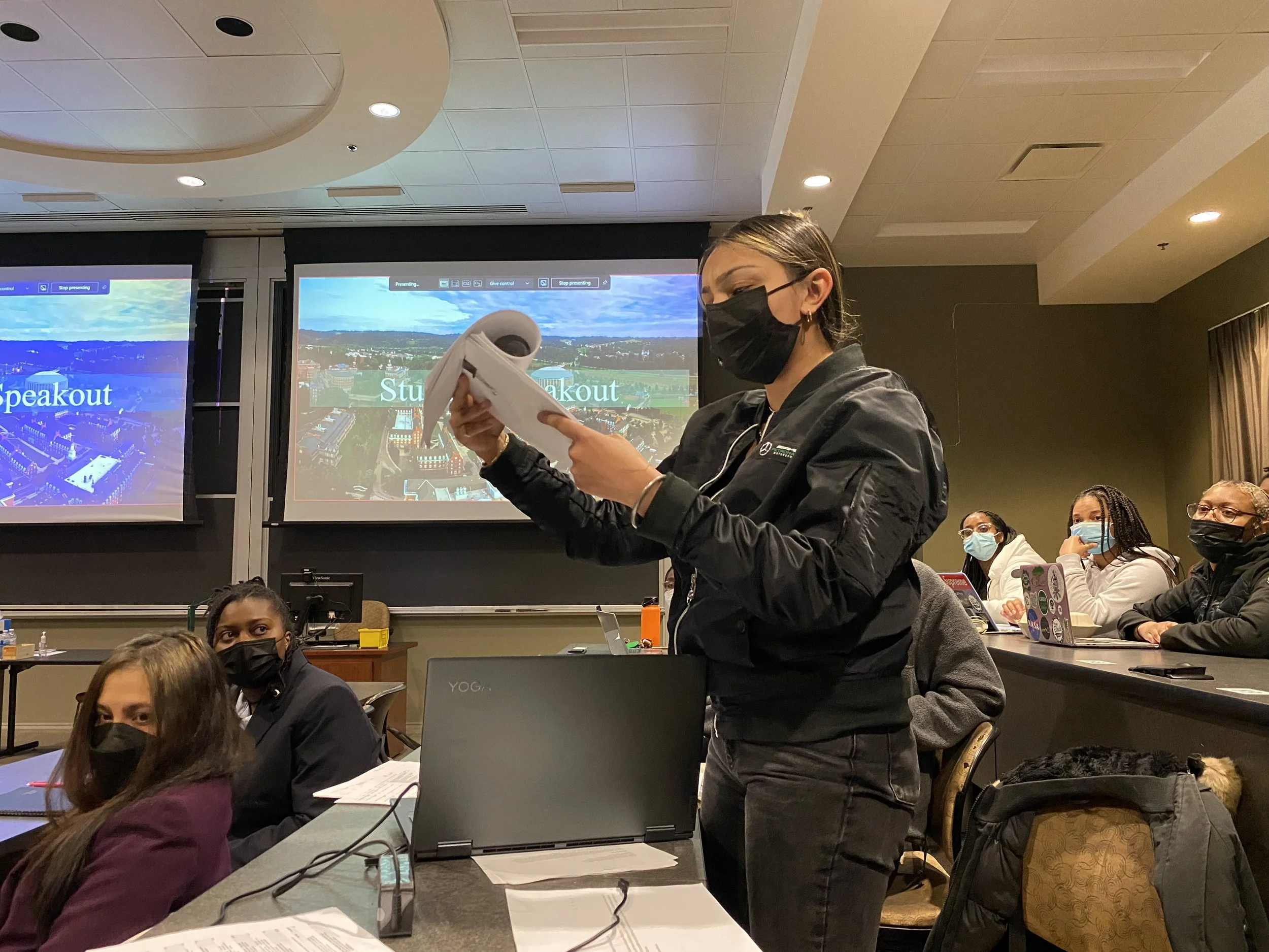 Minority Association for Pre-health Students Member Madison Wilson testifies to Kalkat’s outreach with regard to her minority constituents and their organizations. Photo by Audrianna Wilde.