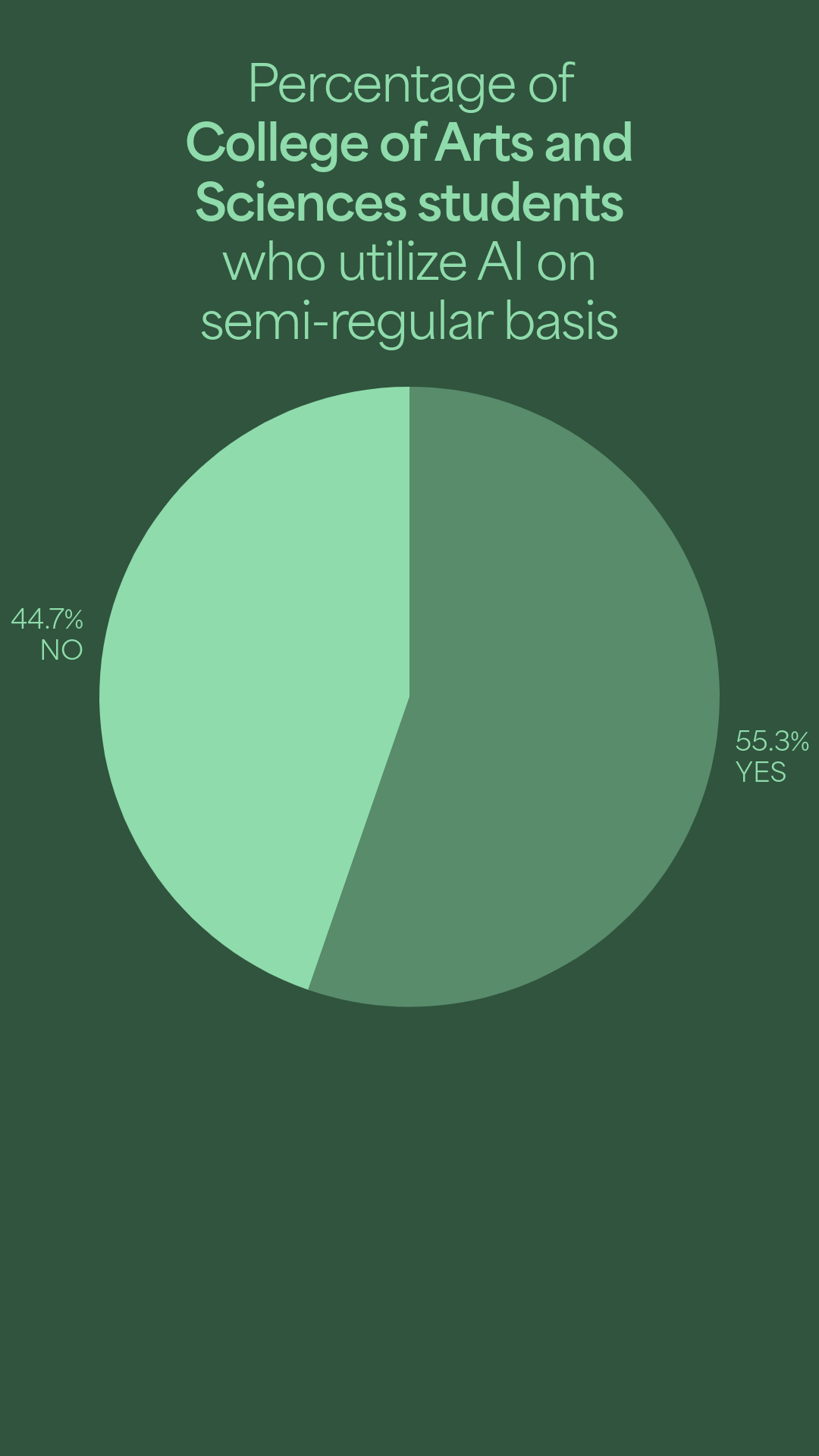 The College of Arts and Sciences, housing the most majors in one college, saw the most responses to the survey. Within these responses, 55.3% of them admitted to using AI.