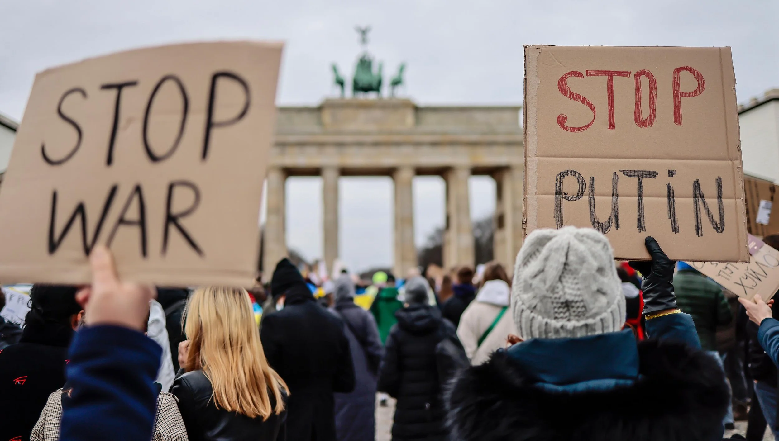 “Demonstrators hold placards reading “Stop War” and “Stop Putin” during an anti-war protest at the Brandenburg gate in Berlin, Germany, February 27, 2022.” Photo by Hannibal Hanschke, Getty Images.
