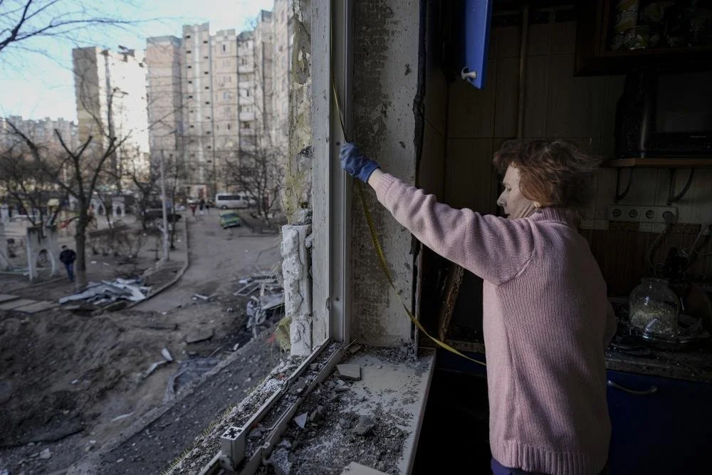 “A woman measures a window before covering it with plastic sheets in a building damaged by a bombing the previous day in Kyiv, Ukraine, Monday, March 21, 2022.” Photo by Vadim Ghirda, AP Photo.