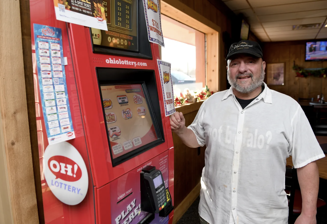 Mike Sylvester, owner of Hide-A-Way Buffalo Grill in Canton, Ohio stands by a sports betting kiosk, Dec. 2022. Photo by Julie Vennitti Botos, The Canton Repository.