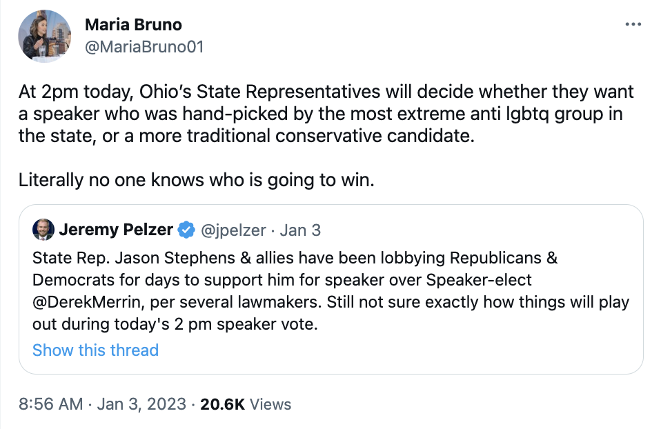Equality Ohio’s Public Policy Director Maria Bruno tweeted during the election, “At 2pm today, Ohio’s State Representatives will decide whether they want a speaker who was hand-picked by the most extreme anti LGBTQ group in the state, or a more traditional conservative candidate. Literally no one knows who is going to win.”