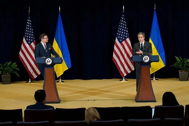 “Secretary of State Antony Blinken, right, joined by Ukraine's Foreign Minister Dmytro Kuleba, speaks during a news conference at the State Department in Washington, Tuesday, Feb. 22, 2022.” Photo by Carolyn Kaster/Pool/AP.