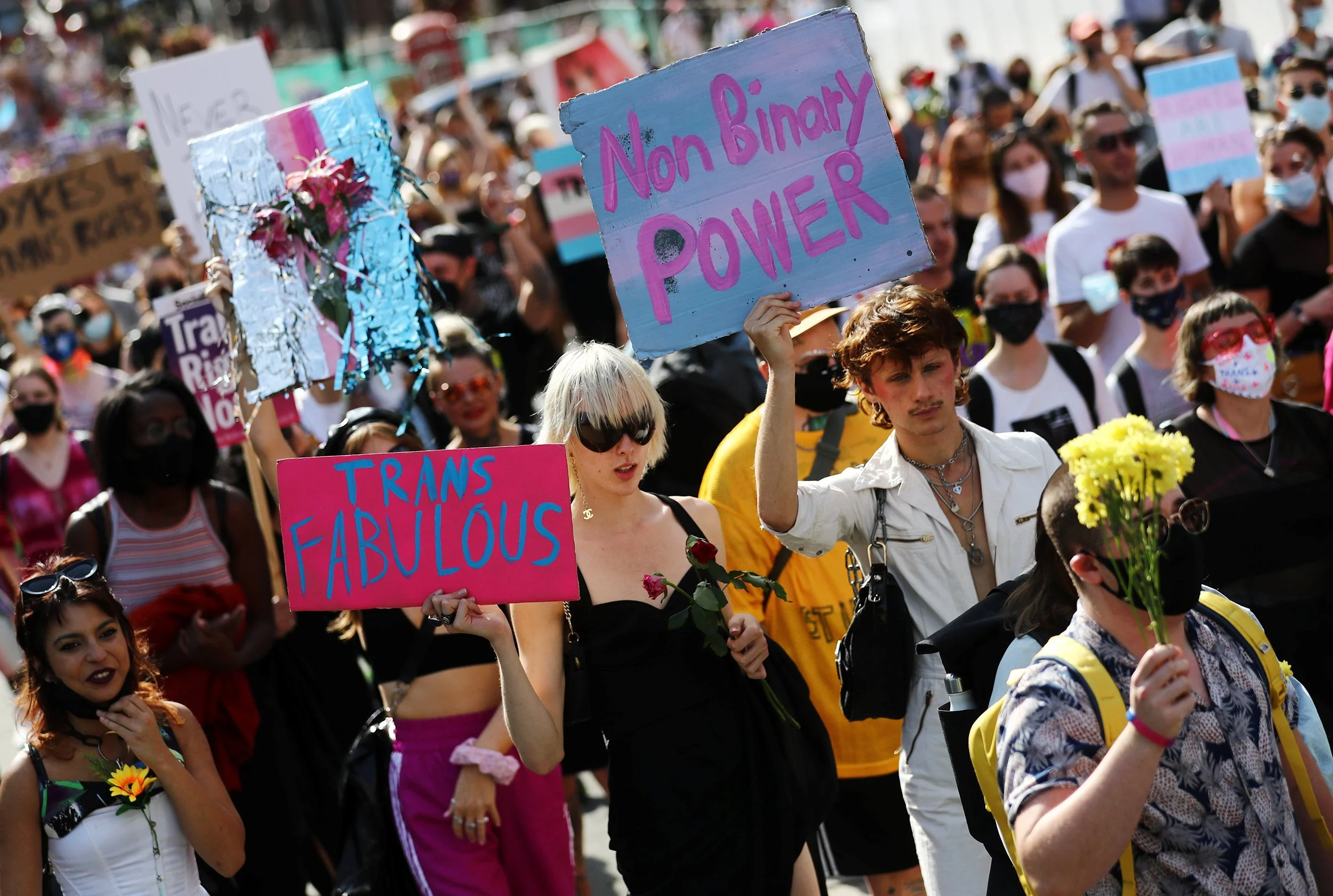 “Protesters at the Trans Pride in London on Sept. 12, 2020.” Photo by Simon Dawson, Reuters.