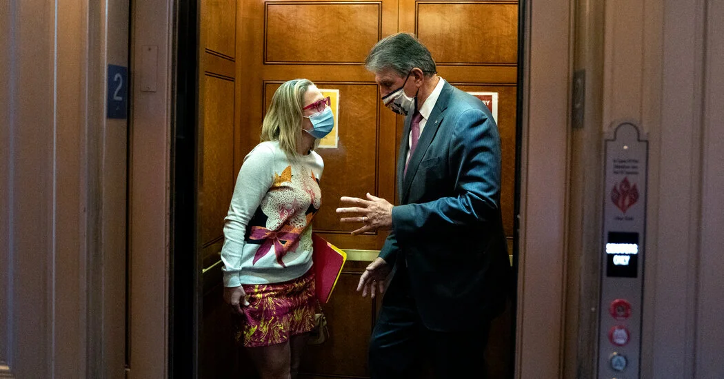 Senator Joe Manchin, right, and Senator Kyrsten Sinema speaking at the Capitol in Washington D.C. in May of 2021. Photo by Stefani Reynolds of The New York Times.